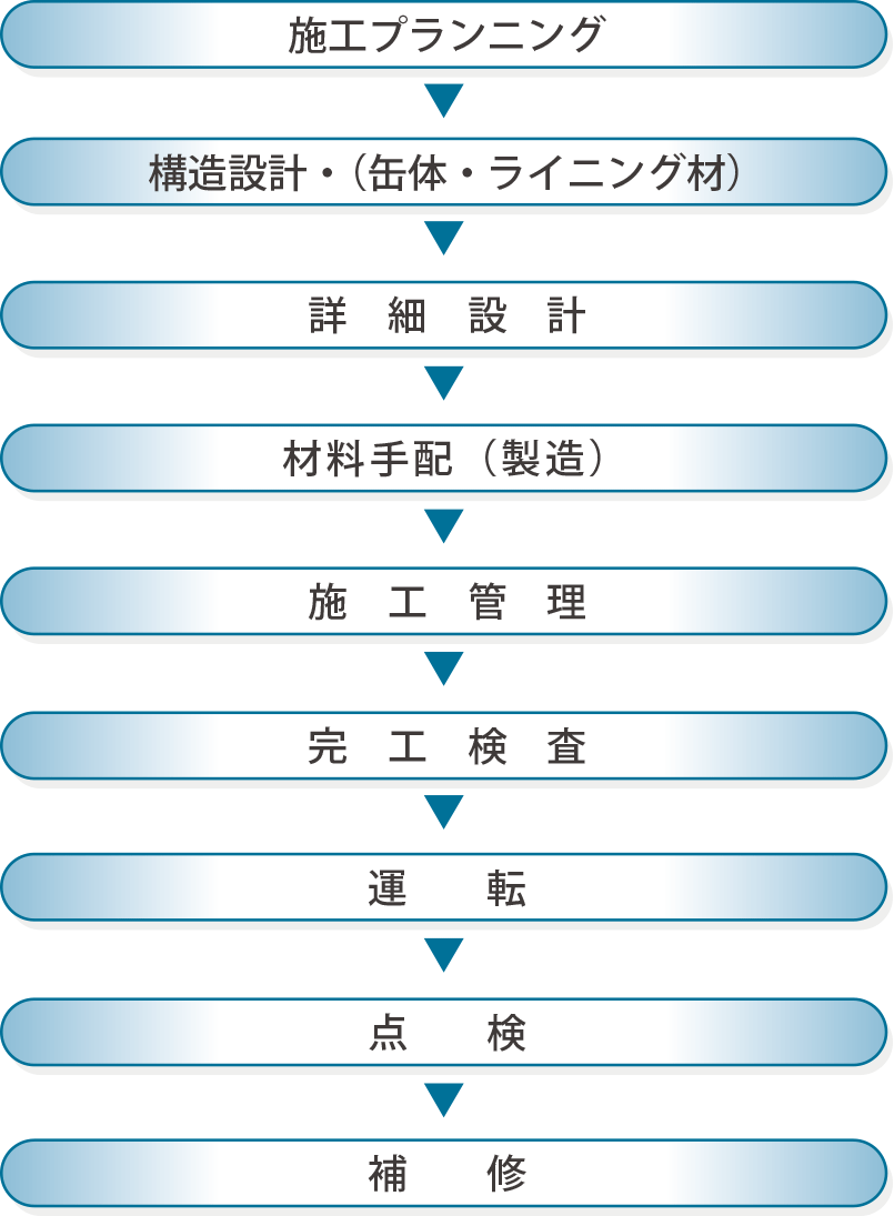 イワオジキは、長年にわたり耐蝕材料の特性とその施工使用方法の技術の蓄積と研究を重ねてまいりました。 これらをもとに下図に示されるイワオジキの耐蝕システムエンジニアリングは、用途の多様化を的確にとらえて最適なプランニングをお約束いたします。 また国内は勿論、海外数十カ国でのプラント建設で得た当社の施工管理技術を充分にご活用ください。