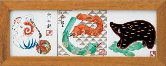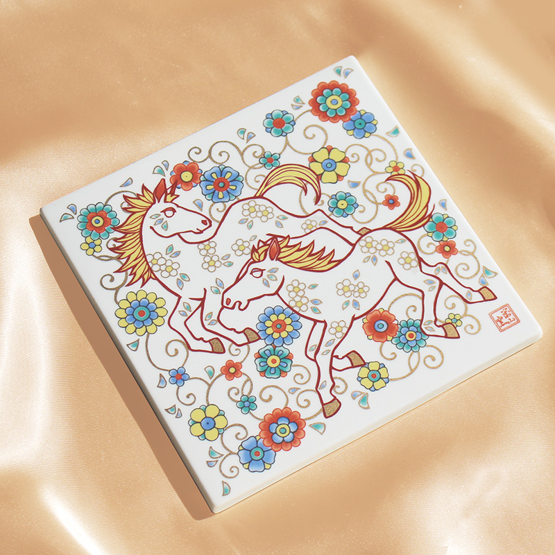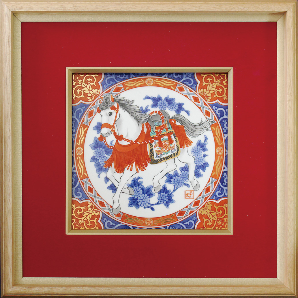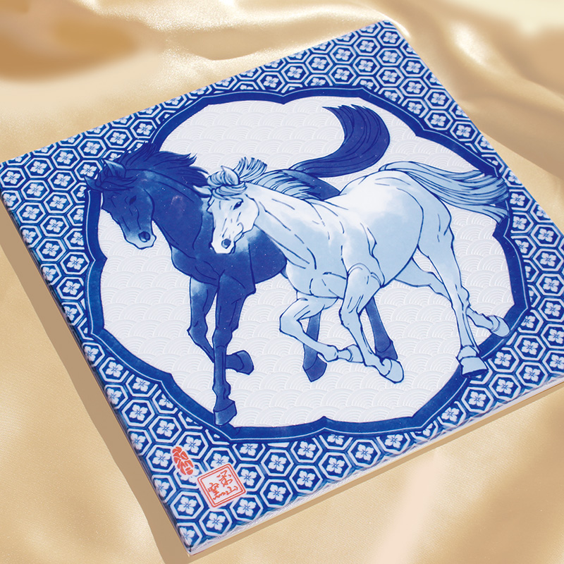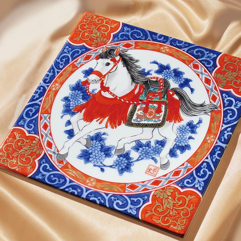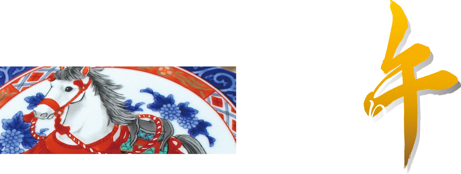 | 馬は世界中で愛されている生き物で、世界各地で馬をモチーフにした人形やお守りが作られています。幸福を運んでくる生き物と言い伝えもあり、その他にも「立身出世」の象徴でもあるとされます。「色絵 花唐草午」では仔馬たちが戯れている様子を描いています。 |