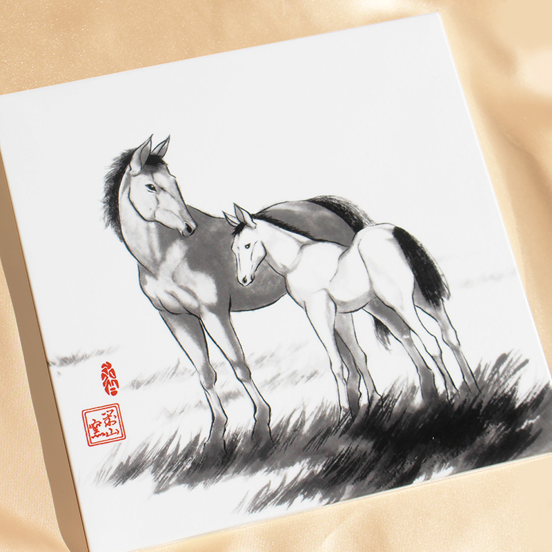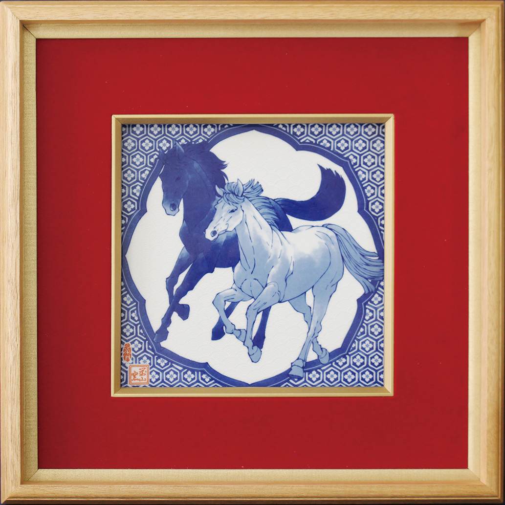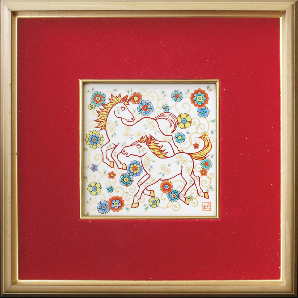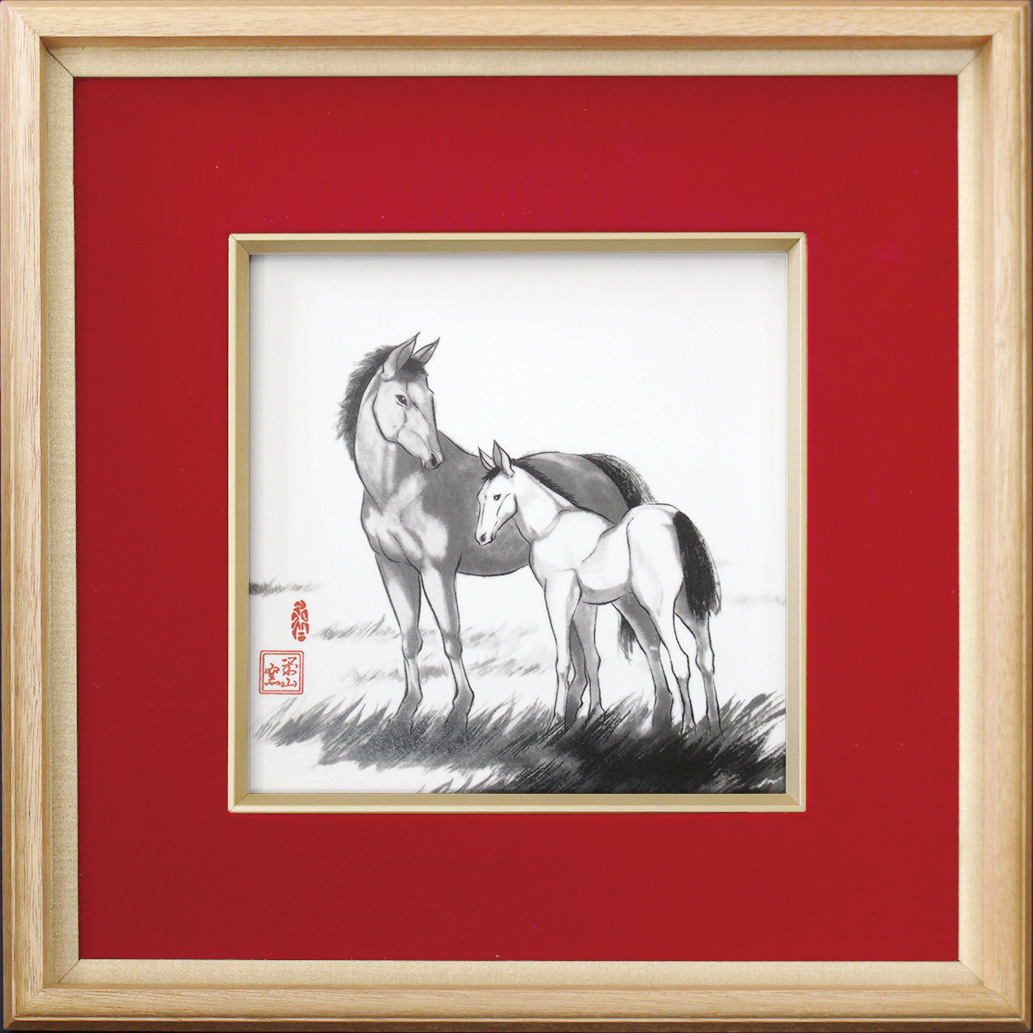 馬は一回のお産で一頭を生み、そして親子はぴったりと寄り添って暮らします。これは草原など見晴らしの良い場所で暮らす野生の馬たちが、子孫を未来へ繋いでいくための性質です。仔馬は生後一時間程度で歩いたり走ったりできるようになります。そのことから「躍進の兆し」や「立身出世」の象徴とされています。 「墨絵 親子午」は、そんな馬たちの穏やかな親子の時間が描かれた作品です。 |