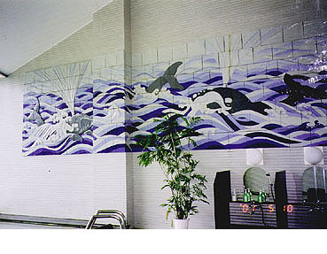 青く澄んだ波、静かな森浦湾を眼下に見おろす展望大浴場。男湯に、那智の火祭りの、女湯に、潮吹く鯨の壁画を制作。