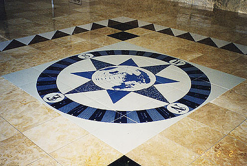 STSからの発信、佐賀からの情報発信の意をこめて、佐賀を中心とする世界地図をえがいた方位盤を玄関ホールの床に埋め込んだ。